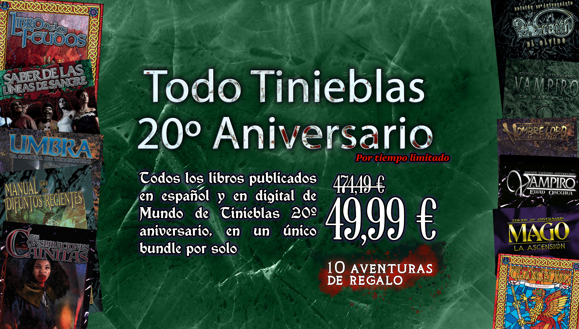 Llévate toda la línea de Mundo de Tinieblas 20º Aniversario y 10 aventuras gratis, con un PVP de 474,49 €, por solo 49,99 € ¡Por tiempo limitado!